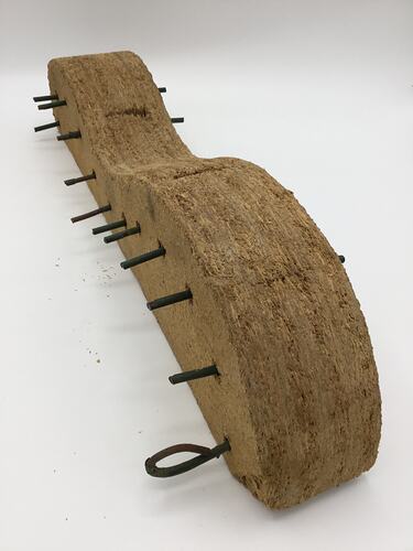 Mould section (one of two) for a guitar with series of screws hand-made from particle board by Maltese migrant Joseph Scerri in his workshop at home in Brunswick between 1990 and when he made his last guitar in 2006. Joseph would steam the sides of the guitar he was making and tie together with string.