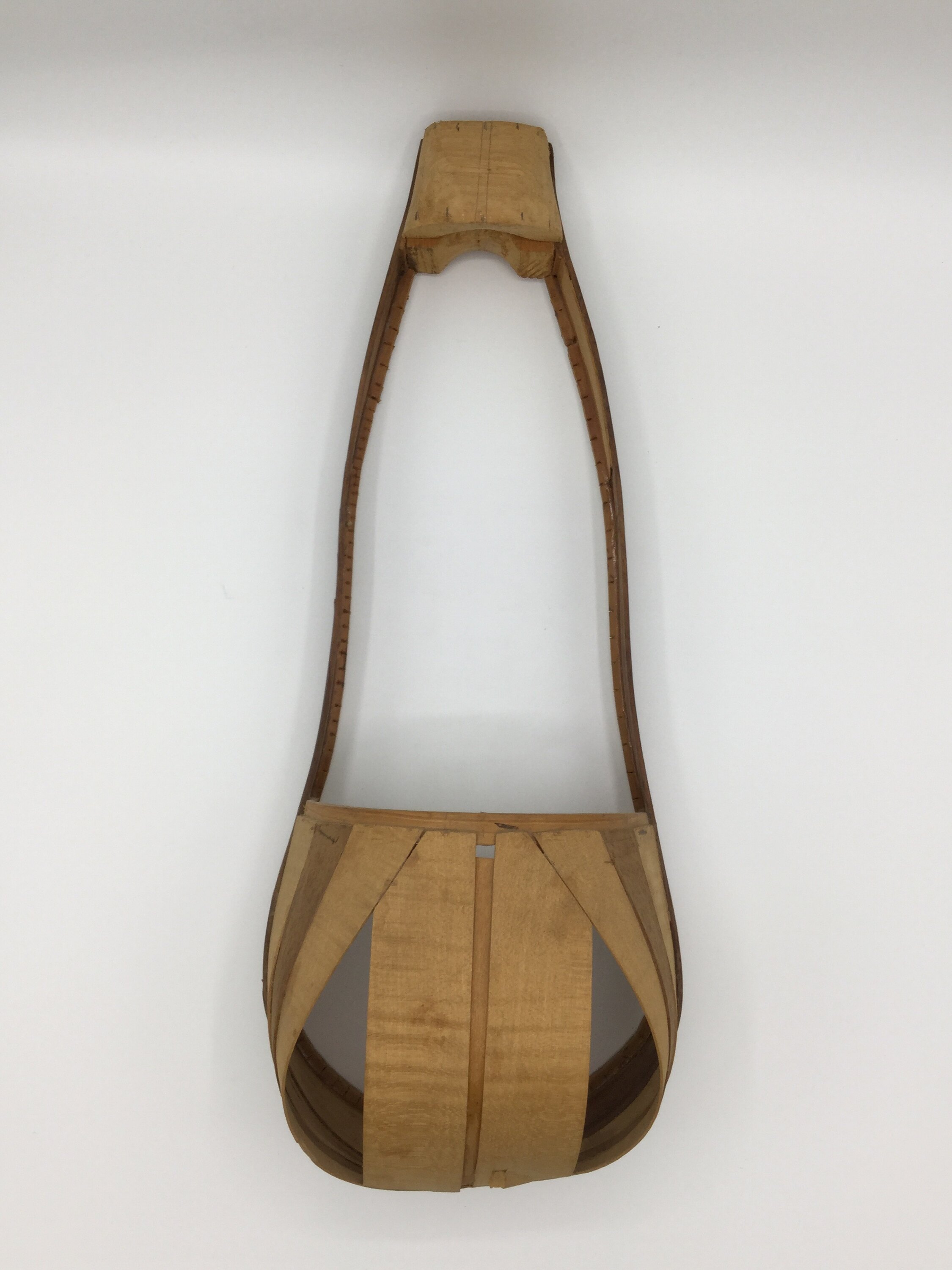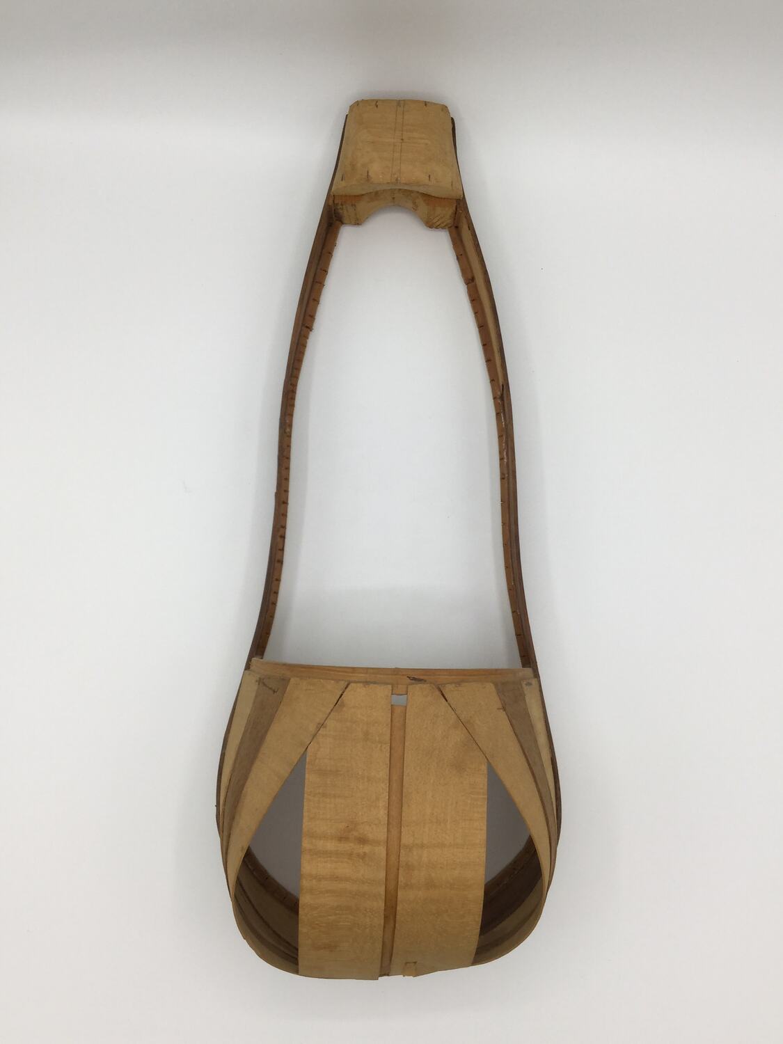 Partially completed guitar base, narrow round top with wide bottom and with some of bottom of base supported with timber slats.