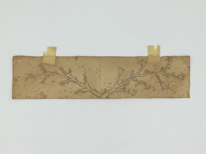 Sketch for carving guitar decoration by Maltese migrant Joseph Scerri in his workshop at home in Brunswick between 1990 and when he made his last guitar in 2006. The sketch is in pencil on paper and features two branches. The sketch was adhered to a wall in Joseph's workshop along with other sketches and pictorial inspiration.