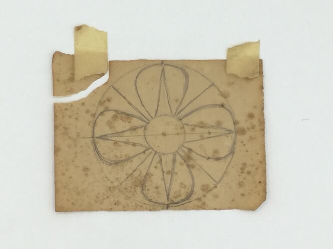 Sketch for carving guitar decoration by Maltese migrant Joseph Scerri in his workshop at home in Brunswick between 1990 and when he made his last guitar in 2006. The sketch is in pencil on paper and features a geometric flower design. The sketch was adhered to a wall in Joseph's workshop along with other sketches and pictorial inspiration.