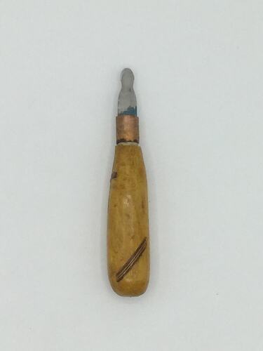 Small knife with hand-carved wooden handle, made and used by Maltese migrant Joseph Scerri in his workshop at home in Brunswick between 1980s and 2010s. This knife was amongst many tools used by Joseph for his woodworking activities, creating guitars, furniture and small furnishings. He made many small knives often having turned the metal blades himself and he made all the wooden handles, often with carving and inlay details.