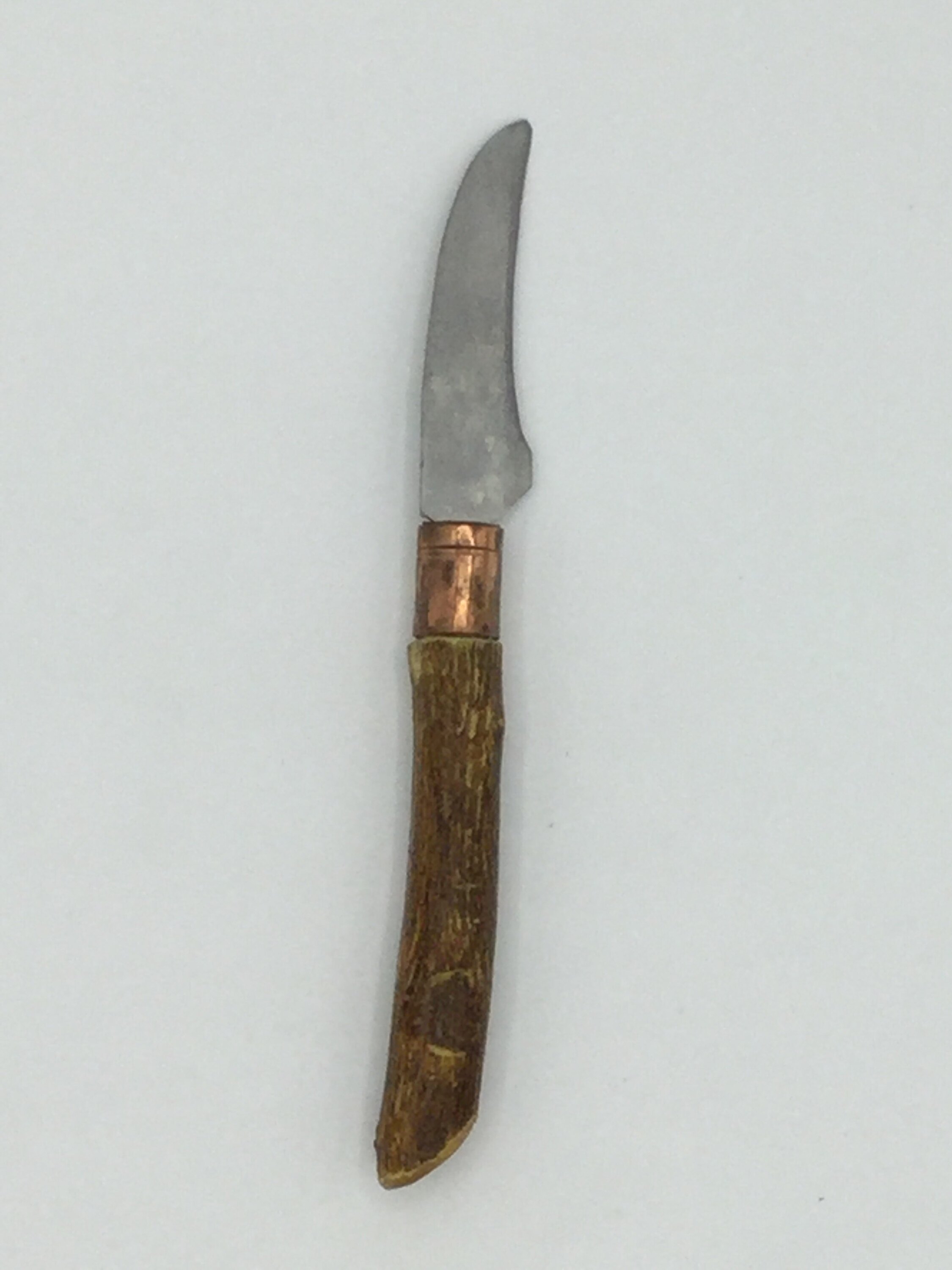This handle of this knife was made from the lemon tree growing in Joseph's backyard. It has a copper ring below the elongated knife blade and a textured handle with no decoration.