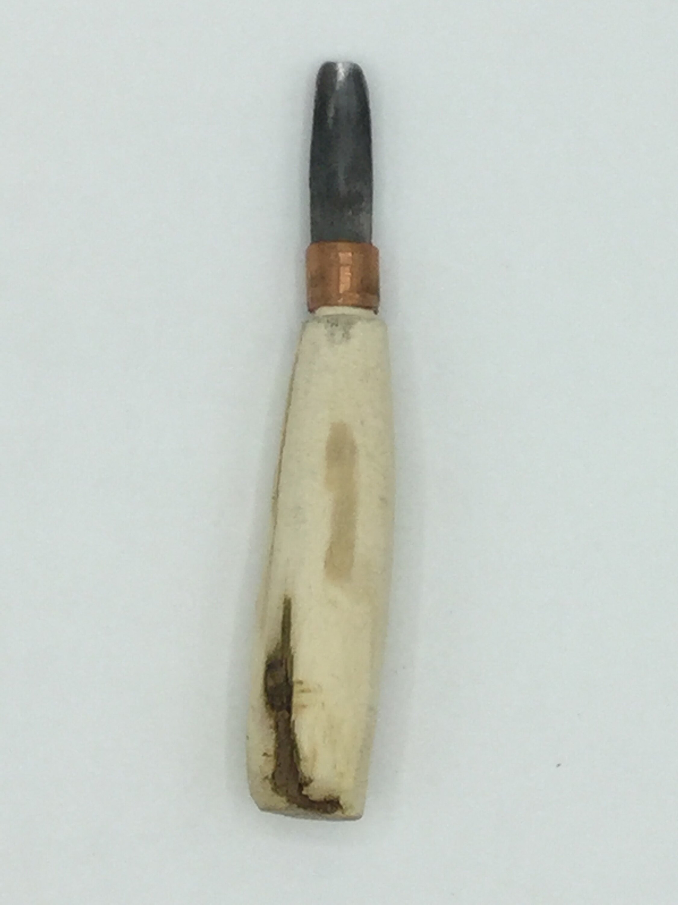 Gouge with a copper ring below the scooped knife blade and a handle which has been shaped but not carved or laquered.