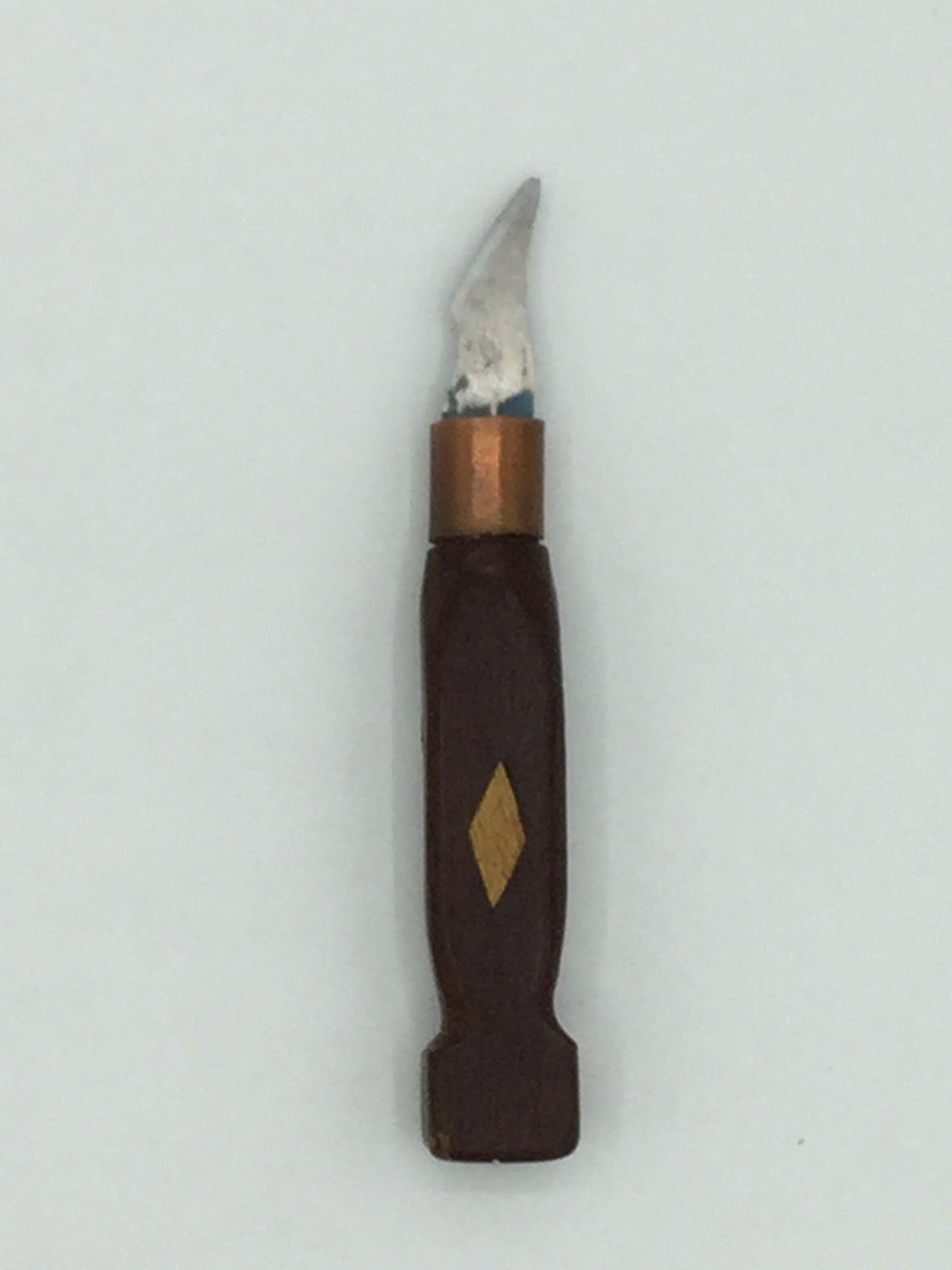 This handle of this knife was made from mahogany. It has a copper ring below the rounded knife blade and a rounded handle with three diagonal lines pattern inlay and a copper decoration near base.