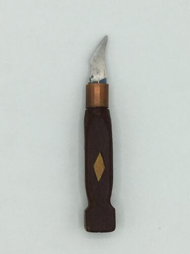Small knife with a hand-carved mahogany timber handle, made and used by Maltese migrant Joseph Scerri in his workshop at home in Brunswick between 1980s and 2010s. This knife was amongst many tools used by Joseph for his woodworking activities, creating guitars, furniture and small furnishings. He made many small knives often having turned the metal blades himself and he made all the wooden handles, often with carving and inlay details.