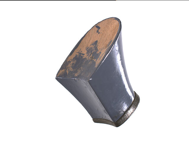 Navy shoe heel sample made in Stafford, England, 1933. It was used at Simpson's Glove Pty Ltd and was found in a box in the shed above the air raid shelter. Amos Simpson had friends in the boot trade, he attempted to assemble shoes but did not go into full manufacture.