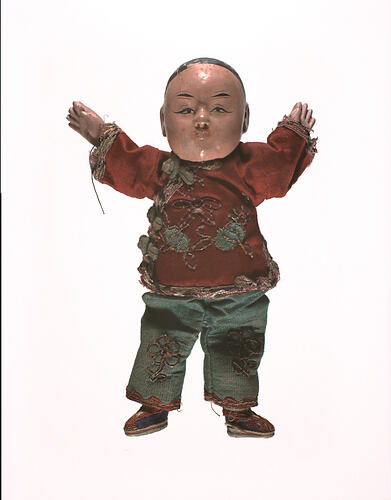 Small Chinese doll dressed in red tunic and green trousers. Coloured braid used as decoration around collar, sleeves and hem of tunic, while green braid is used to indicate buttons across the front of the tunic. Red braid is used around the hem of the trousers, and a flower is embroidered on the front of each leg. The head, body, hands and feet of the doll are made from wood. Both the hands and feet are painted, with features such as the eyes, eyebrows and hair detailed in black. The mouth is also painted and is red in colour. A hole in each of the doll's ears and markings on the top of the head seems to suggest that some type of head-dress may have constituted part of the costume. On the dolls feet, blue slippers are worn, decorated with red braid and thread.