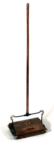'Ewbank Success' wooden carpet sweeper with screw-on wooden handle. Three wheels each side with outer strip of cotton-coated rubber. Protective rubber clamped on each corner of carpet sweeper and two corners of metal frame for handle. Metal control in front right hand side.