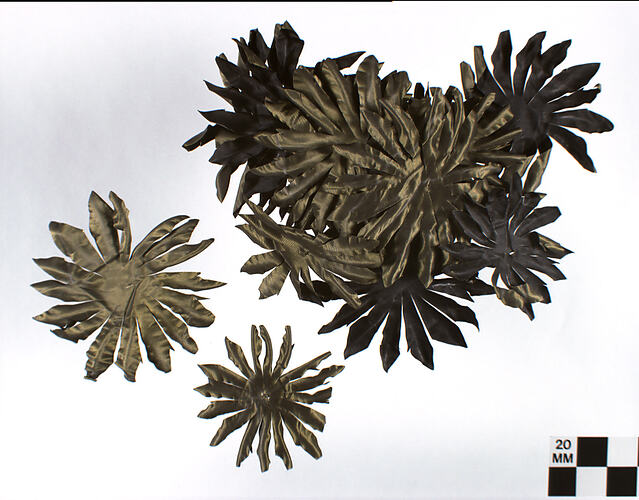 Sixteen pieces of stiffened fabric, dark green on one side, black on the other, cut into flower shapes with curved petal ends and a cut in the middle. Sizes vary from 10 cm to 12 cm wide.