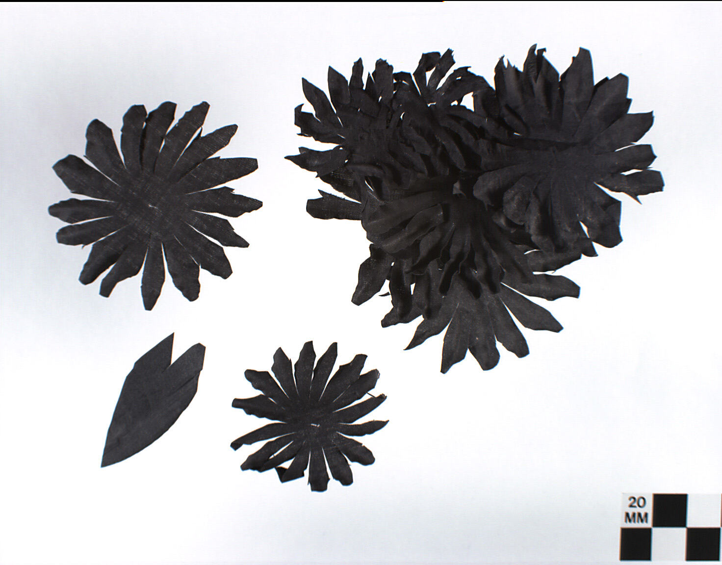 Nine pieces of stiffened black fabric cut into flower shapes with long, curved petals; sizes vary from 9.5 cm to 12 cm diameter. One piece cut from the same fabric 9 cm long and 4 cm wide, curved, tapered, double- pointed at one end.