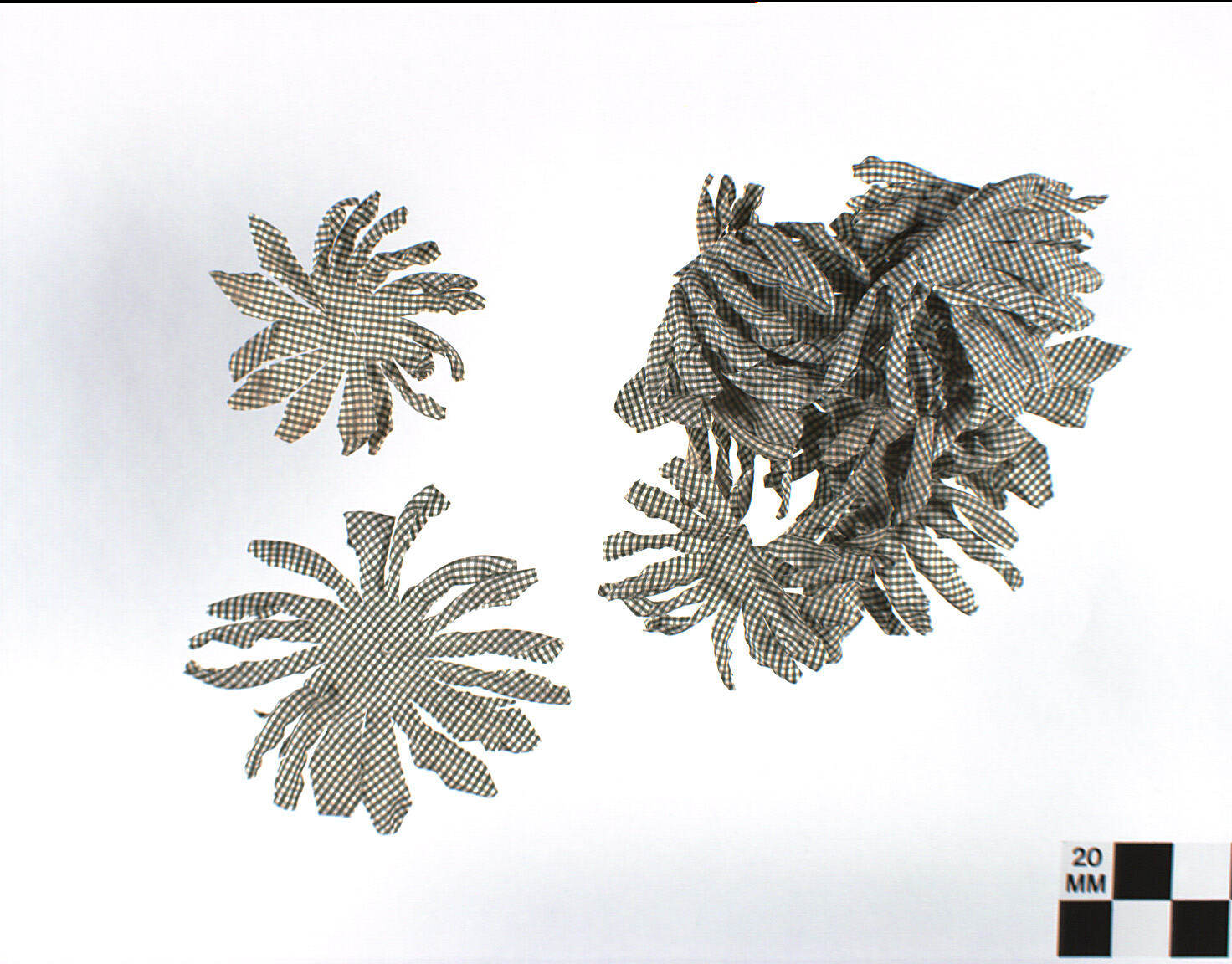 Ten pieces of stiffened green and white check cotton fabric, cut into flower shapes with long, narrow petals, and a cut in the middle. Sizes vary from 9 cm to 11 cm diameter; check size approx 0.15 cm.