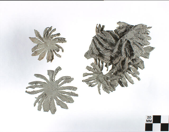 Spray of green and white check artificial flowers made by Marion Kann. Marion (Mimi) was of born in Vienna, Austria in 1910. She immigrated to Australia in 1939, most likely fleeing the persecution of the Nazi regime as she was Jewish. In Australia she married follow a refugee and Austrian Jew Herbert Kann.