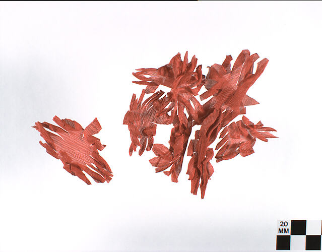 Eight pieces of red crepe cut into flower shapes with long, narrow petals. Each has a small cut in the centre. One petal shape, tapered and double-pointed.