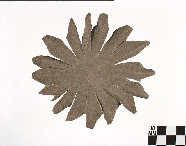 One flower shape, with long, narrow petals, cut from green stiffened crepe, with a small cut in the centre.