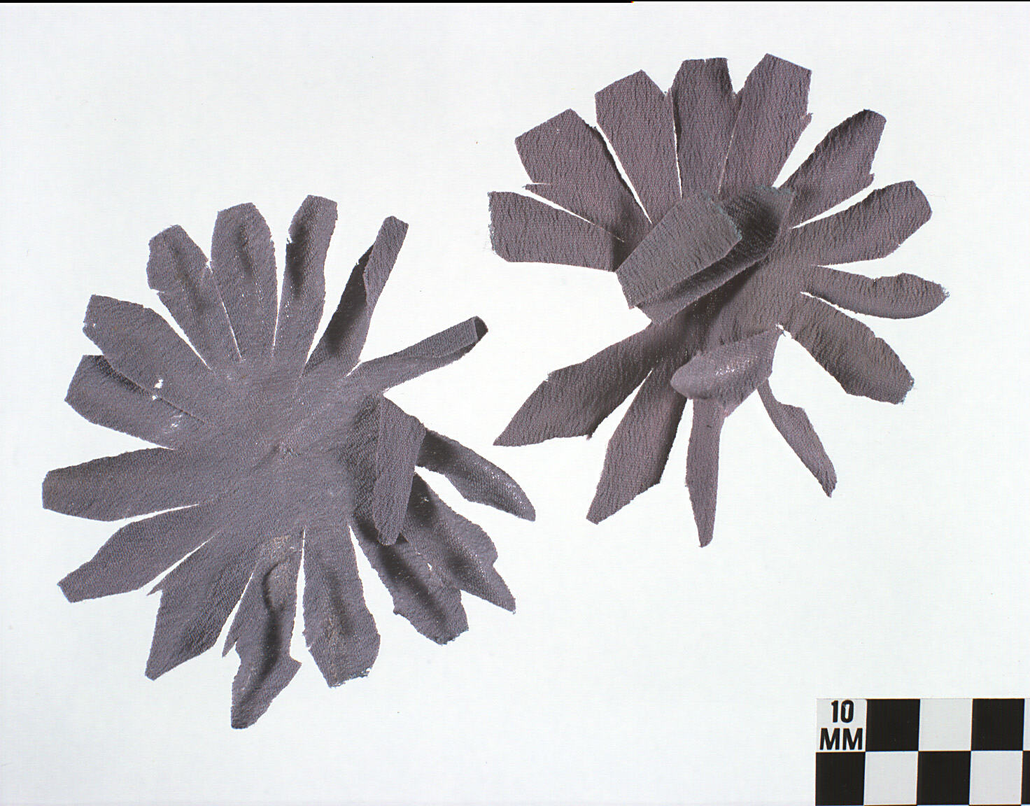 Two flower shapes with long, narrow petals and a small cut in the centre, cut from smoky blue crepe fabric. pale green and dark green.