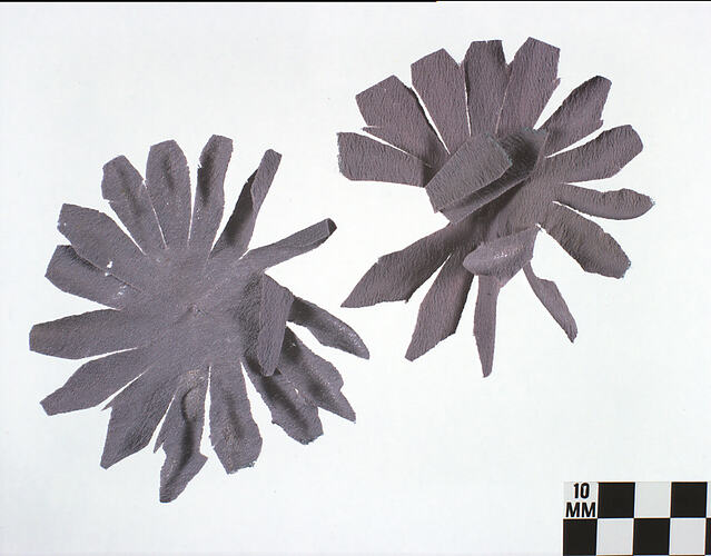 Blue crepe artificial flowers made by Marion Kann. Marion (Mimi) was of born in Vienna, Austria in 1910. She immigrated to Australia in 1939, most likely fleeing the persecution of the Nazi regime as she was Jewish. In Australia she married follow a refugee and Austrian Jew Herbert Kann.