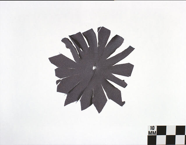 One flower shape, with long, narrow petals, cut from dark blue-grey crepe stiffened fabric, with a small cut in the middle.