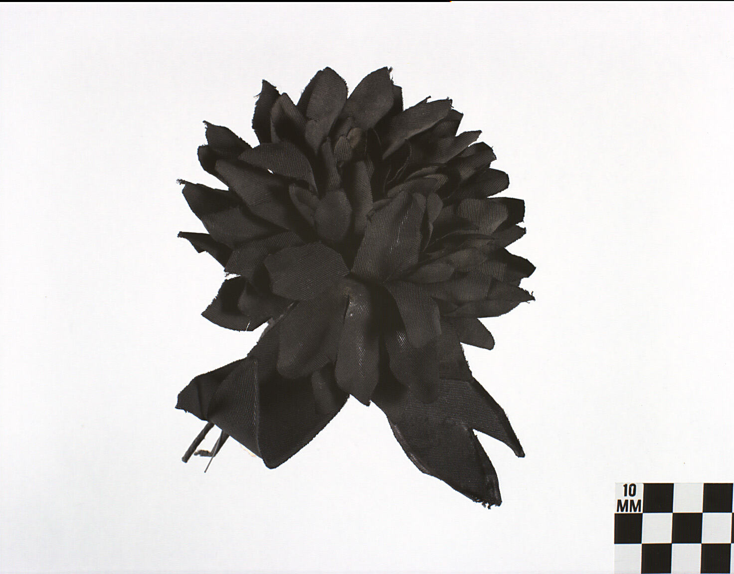 One artificial flower made from black stiffened cotton fabric. Constructed from five layers of petals and two leaf shapes, bound together with wire covered with black paper. One stem has some white paper and wire exposed. Stems are 8 cm long.
