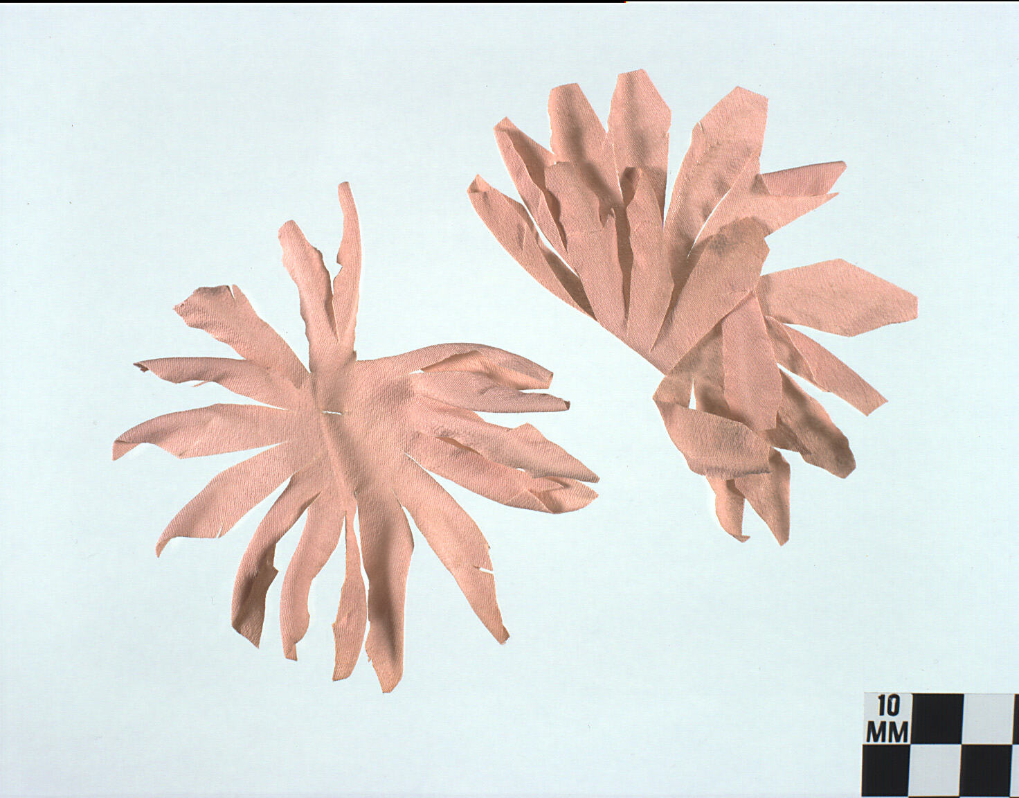 Two flower shapes with long, narrow petals, cut from pale pink silky fabric, with a small cut in the centre.