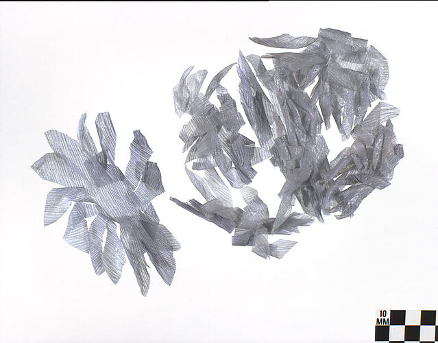 Seven pieces of stiffened pale blue crepe fabric, cut into flower shapes with long, narrow petals. Sizes vary from 9.5 to 12.5 cm diameter. Crepe has a slightly glittery appearance.
