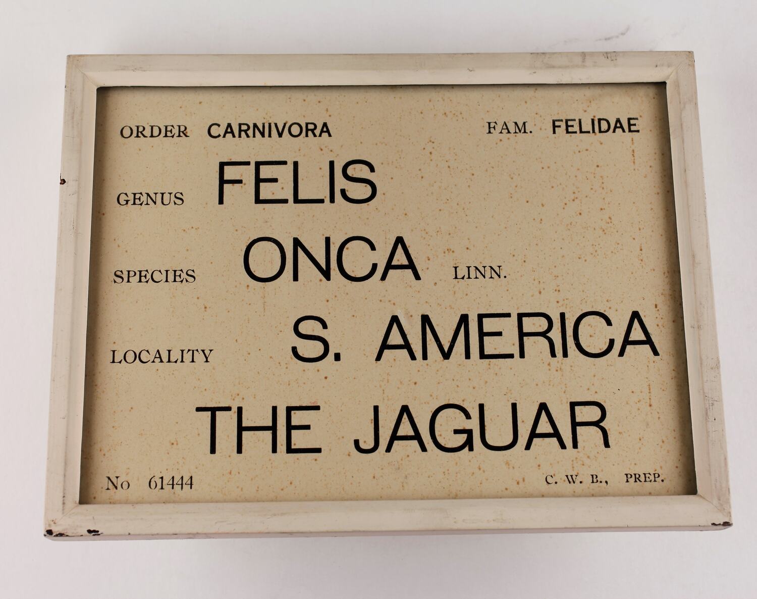 ORDER. CARNIVORA. FAM.FELIDAE. / GENUS. FELIS. / SPECIES. ONCA Linn./ LOCALITY. S.AMERICA / THE JAGUAR / 61444 / C.W.B PREP.