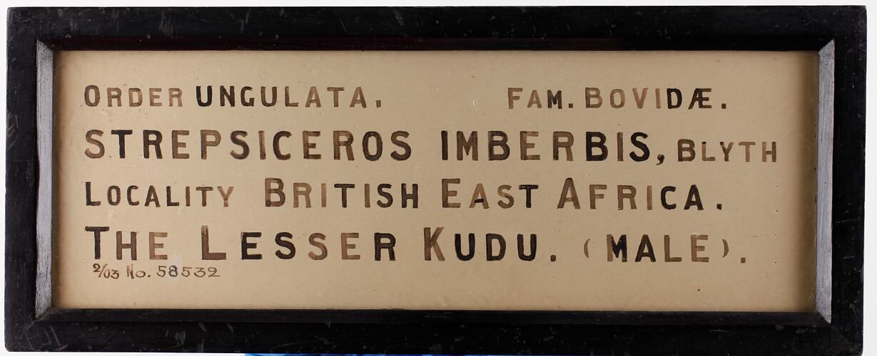 ORDER. UNGULATA. FAM.BOVIDAE. / STREPSICEROS IMBERBIS, BLYTH / LOCALITY. BRITISH EAST AFRICA / THE LESSER KUDU. (MALE). / 2/03 No. 58532