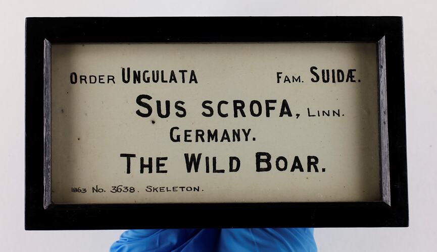 ORDER. UNGULATA. FAM.SUIDAE. / SUS SCROFA, LINN. / GERMANY. / THE WILD BOAR. / 1863 No.3638. SKELETON.