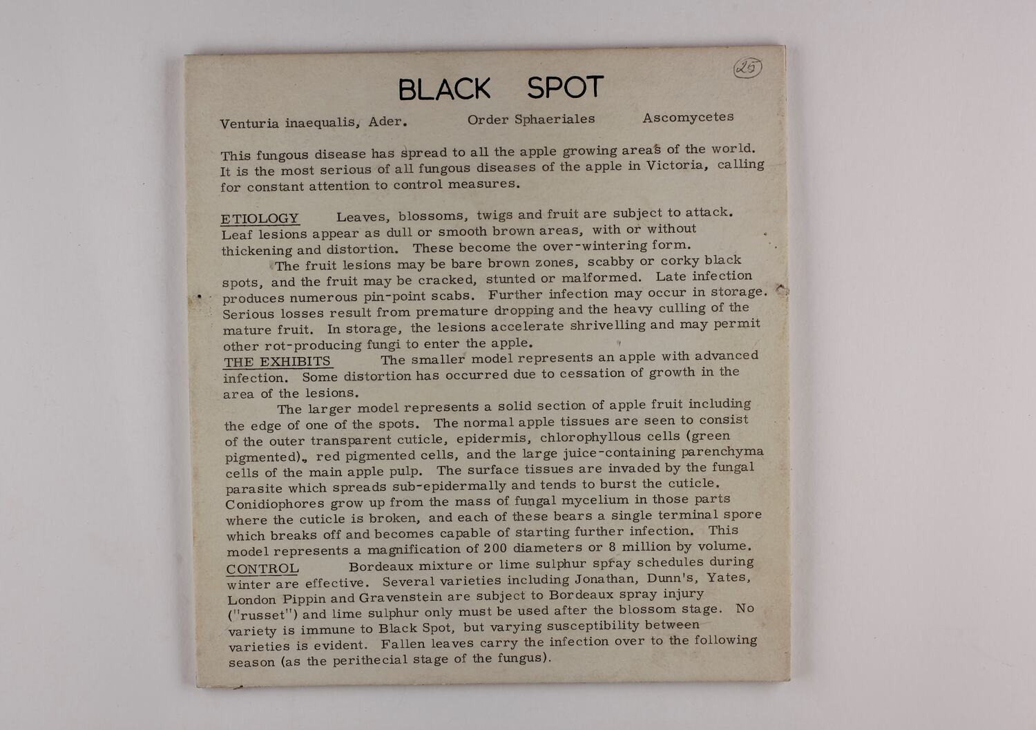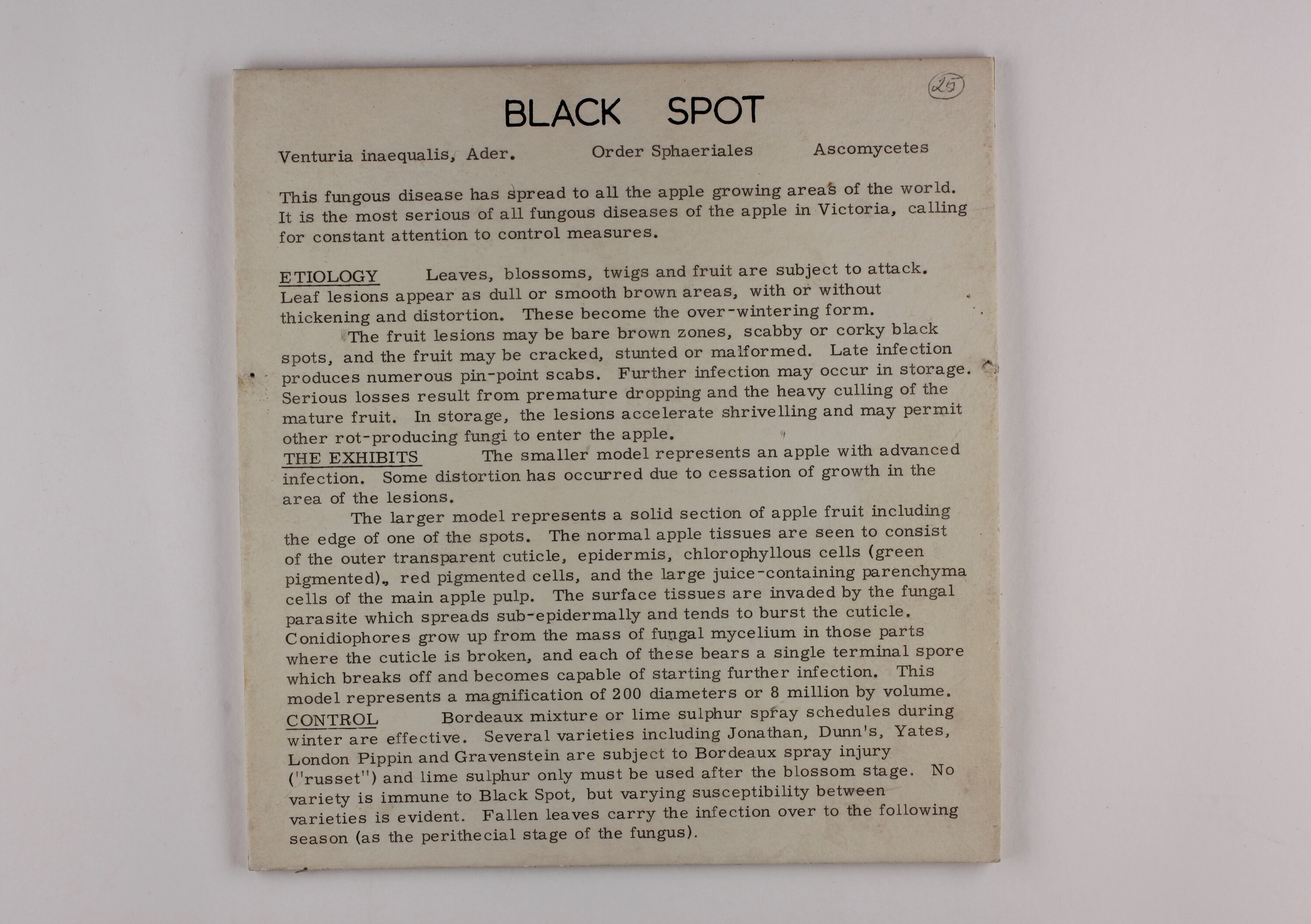 BLACK SPOT / Venturia inaequalis, Ader. Order Sphaeriales Ascomycetes / This fungus disease has spread to all apple growing areas of the world. / It is the most serious of all fungous diseases of the apple in Victoria, calling / for constant attention to control measures. / ETIOLOGY [Extensive text] / THE EXHIBITS [Extensive text] / CONTROL [Extentive text]