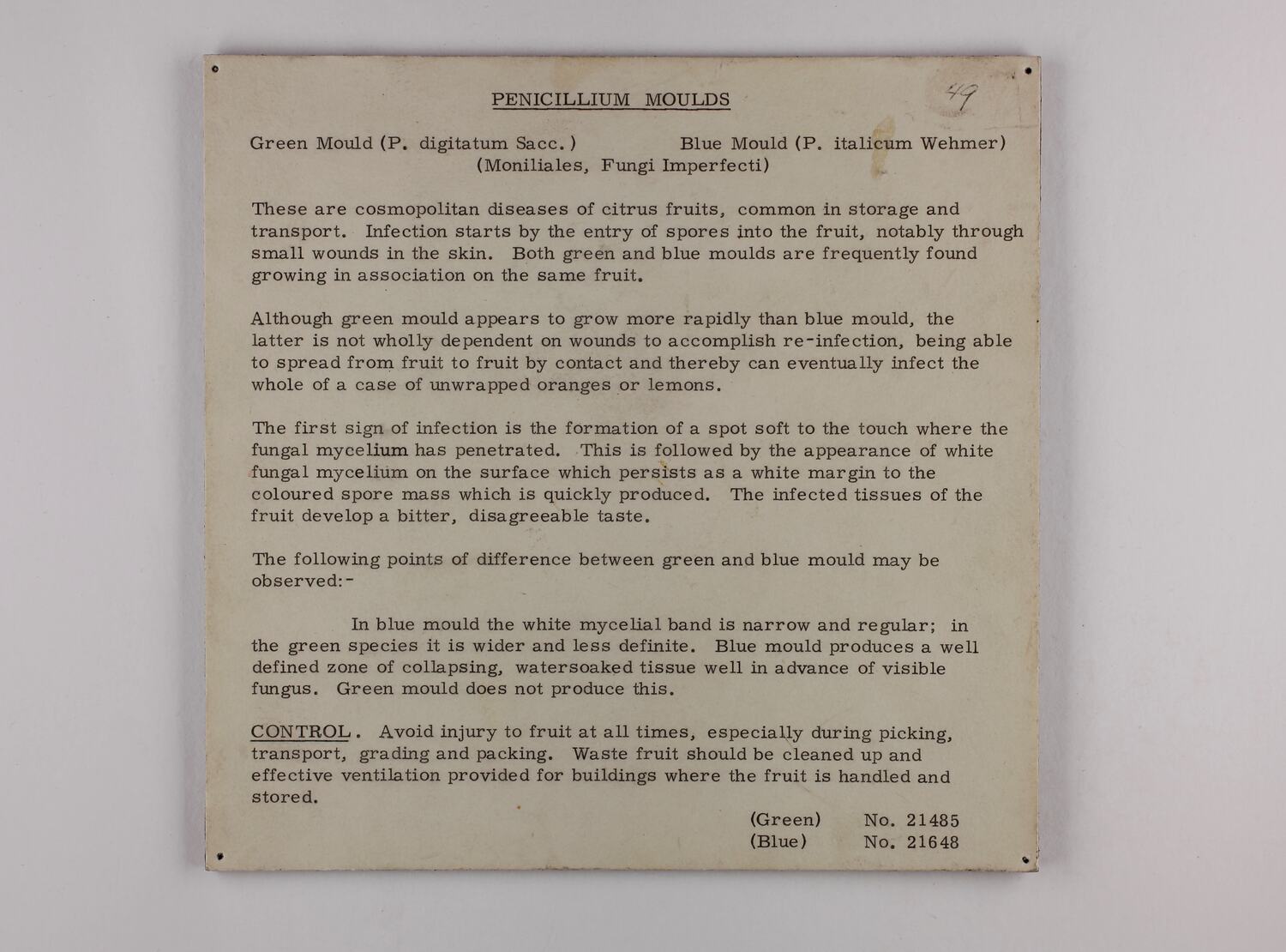 PENICILLIUM MOULDS / Green Mould (P. digitatum Sacc.) Blue Mould (P. italicum Wehmer) / (Moniliales, fungi Imperfecti) / [Extensive text] / CONTROL. Avoid injury to fruit at all times, especially during picking, / transport, grading and packing. Waste fuit should be cleaned up and / effective ventillation provided for buildings where fruit is handled and stored. / (Green) No.21485 / (Blue) No. 21648