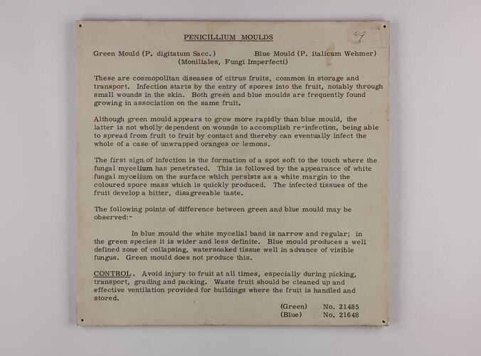 This didactic exhibition label from the Industrial and Technological Museum presents one of Victoria's major impacts on citrus fruit; Penicillium Moulds.