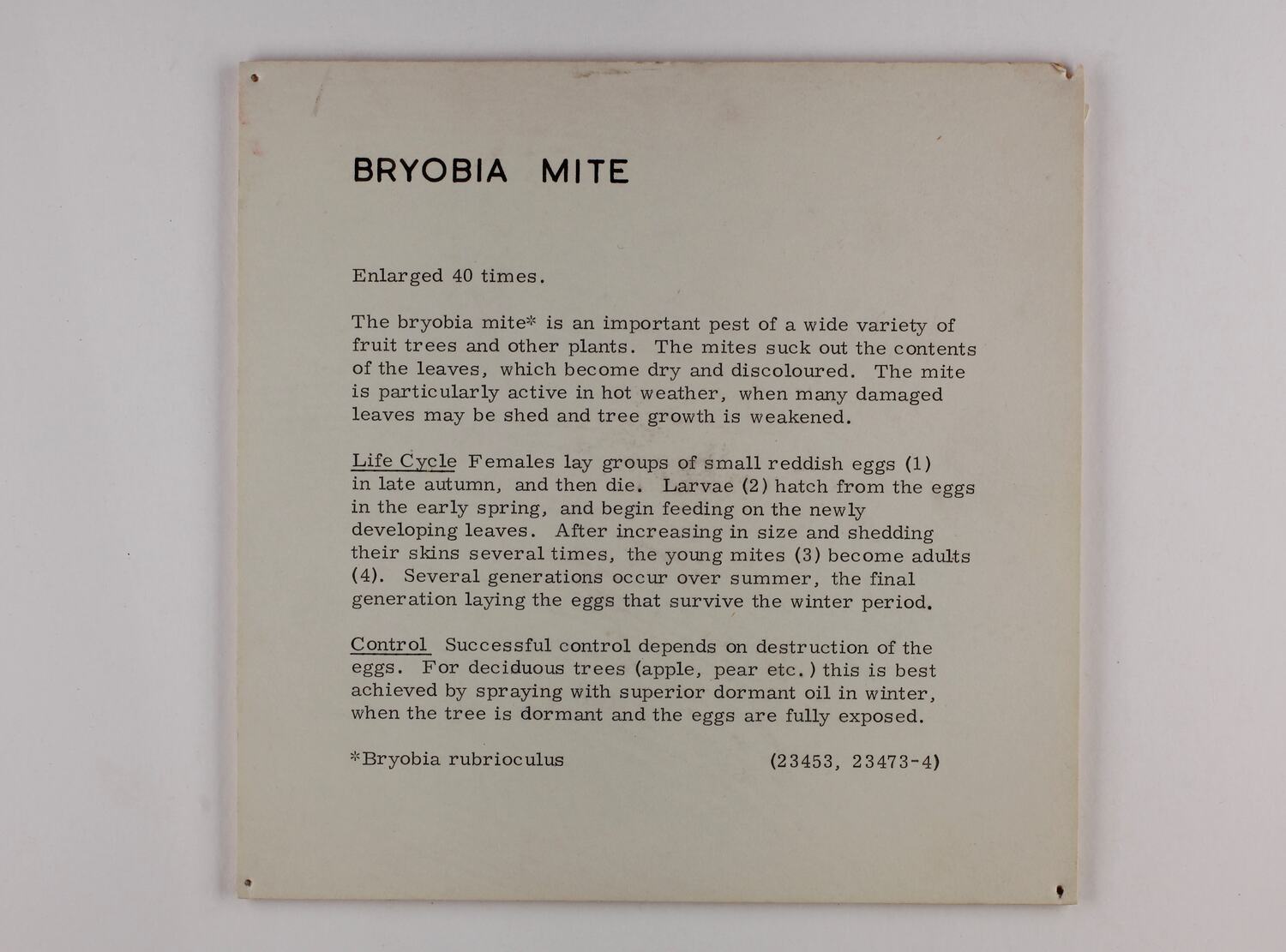 BRYOBIA MITE / Enlarged 40 times. / The bryobia mite* is an important pest of a wide variety of / fruit trees and other plants. The mites suck out the contents / of the leaves, which become dry and discoloured. The mite / is particularly active in hot weather, when many damaged / leaves maybe shed and tree growth weakened. / Life Cycle [Extensive text] / Control [Extensive text] / *Bryobia rubrioculus (23453, 23473-4)
