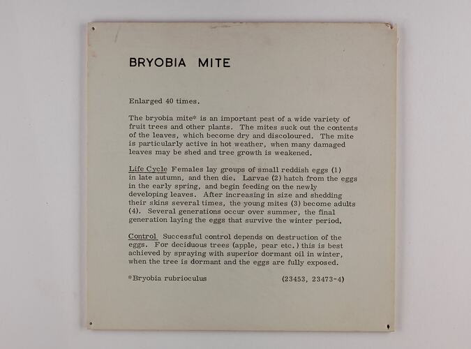 This didactic exhibition label from the Industrial and Technological Museum presents one of Victoria's major impacts on citrus fruit; Bryobia Mite.