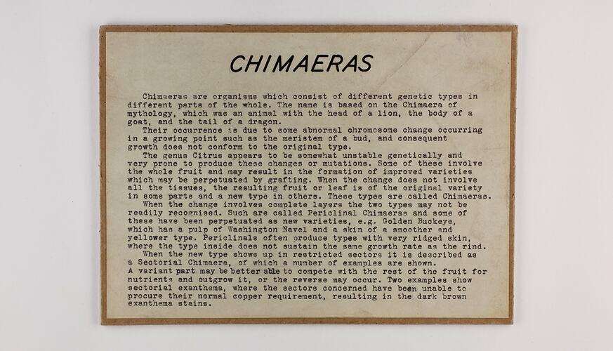 This didactic exhibition label for Citrus (Oranges) Chimaeras from the Museum of Applied Science presents the concept of Chimeras; organisms which consist of different genetic types in different part of the whole in this instance in citrus varieties.
