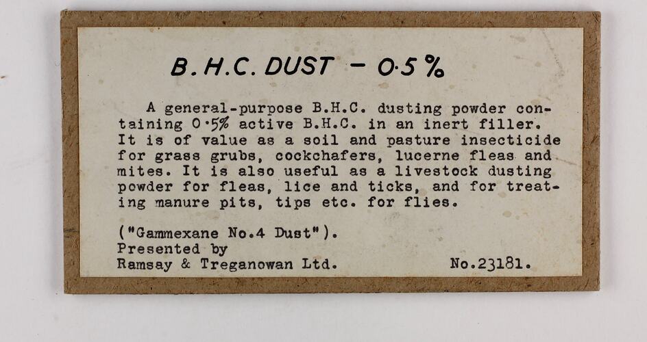 Dating from the circa 1950 era of the Applied Science arm of what later became Museums Victoria, this label employs a standard approach for Applied Science. It illustrates how the preparation works in combination and a typical use scenario, in this instance in the control of grass grubs, cockchafers, lucerne fleas and mites, and for livestock dusting for flies, lice and ticks. The accompanying exhibit was a commercially available sample of "Gammexane No.4 Dust" presented by Rasmsay & Treganowan Ltd. (See related records.)