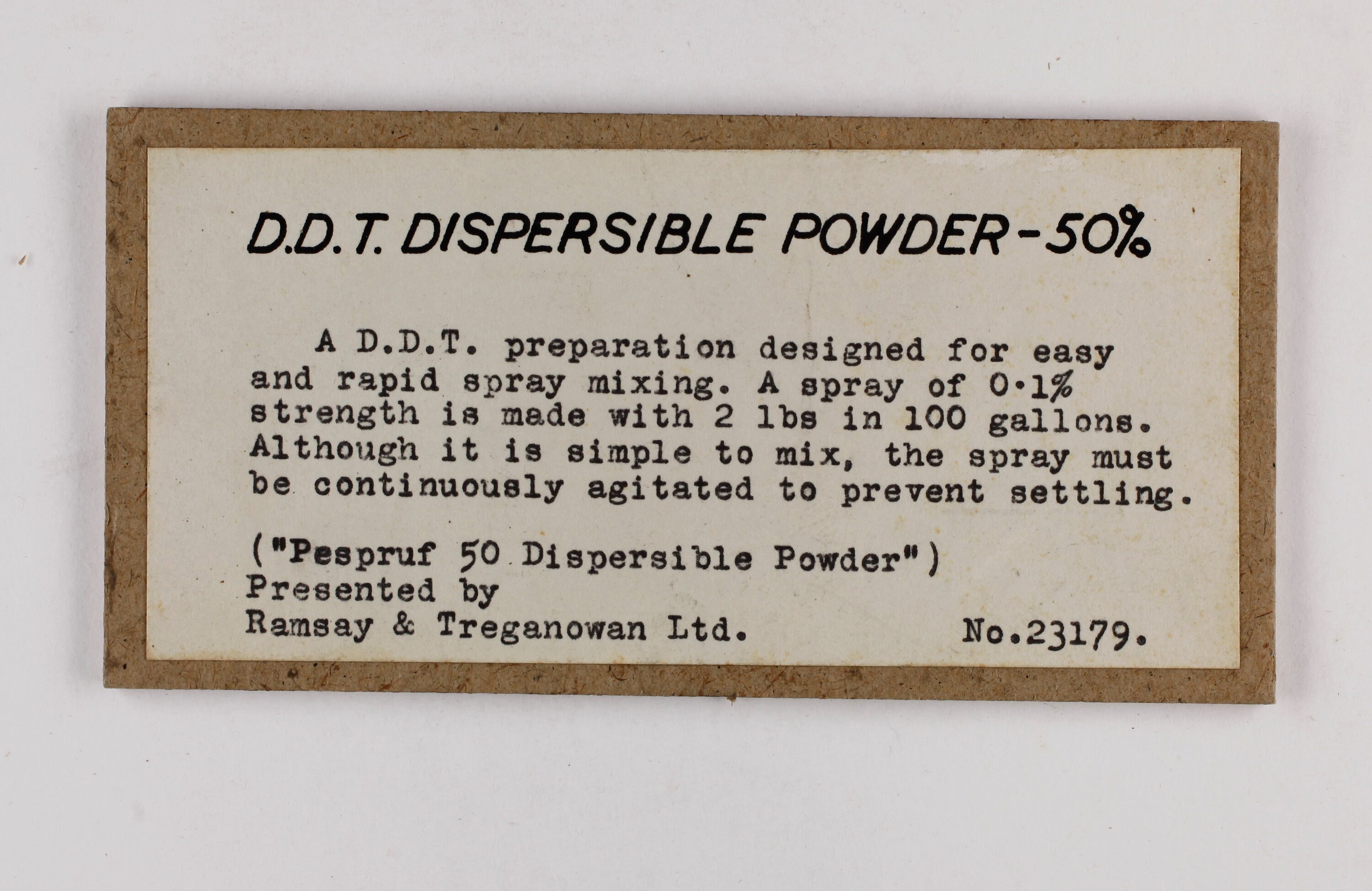D.D.T. Dispersible POWDER - 50% / A D.D.T. preparation designed for easy / and rapid spray mixing. A spray of 0.1% -strength is made with 2lbs in 100 gallons. / Although it is simple to mix, the spray must / be continuously agitated to prevent settling. / (Pespruf 50 Dispersible Powder.) / Presented by / Ramsay and Treganowan Ltd No.23179