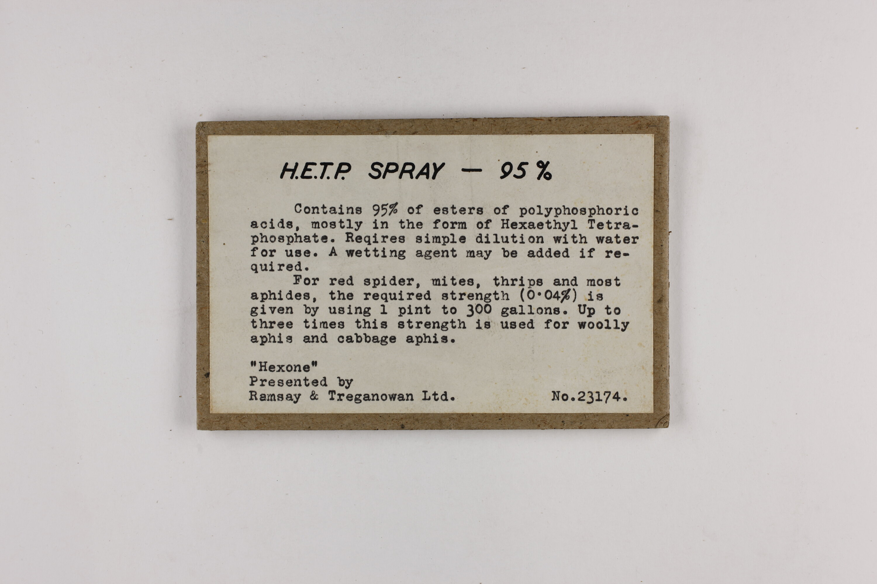 H.E.T.P. Spray - 95% / Contains 95% of easters if polyphosphoric / acids, mostly in the form of Hexaethyl Tetra- / phosphate. Requires simple dilution with water / for use. A wetting agent may be added if re- / quired. / For red spider, mites, thrips and most / aphides, the required strength (0.04%) is / given by using 1 pint to 300 gallons. Up to / three times this strength is used for woolly / aphis and cabbage aphis. / "Hexone" / Presented by / Ramsay and Treganowan Ltd No.23174