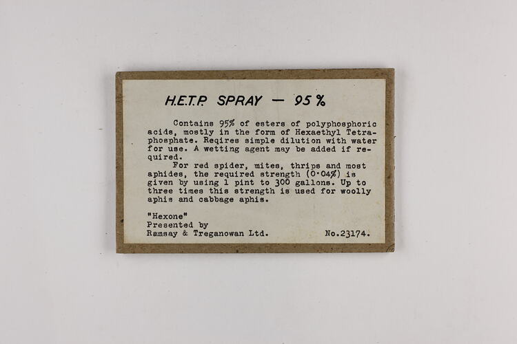 This didactic exhibition label from the Museum of Applied Science presents the use of the pesticide, Hexaethyl Tetraphosphate for use in combating agricultural pests.