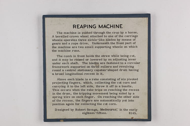This didactic exhibition label is from the Museum of Applied Science / Institute of Applied Science era, circa 1960, what later became Museums Victoria. The label accompanied a model of a horse drawn Reaping Machine. (See related records.)