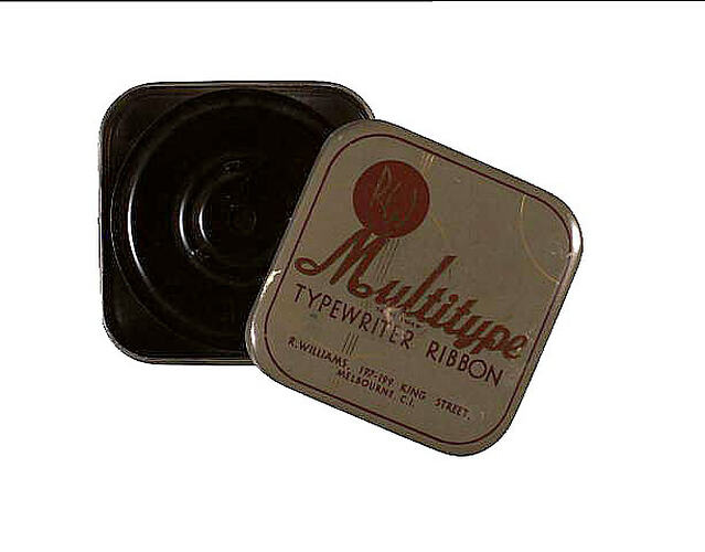 Printed on tin: RW/MULTITYPE/TRADE MARK/TYPEWRITER RIBBON/ R.WILLIAMS 197-199 KING STREET/MELBOURNE, C.1.