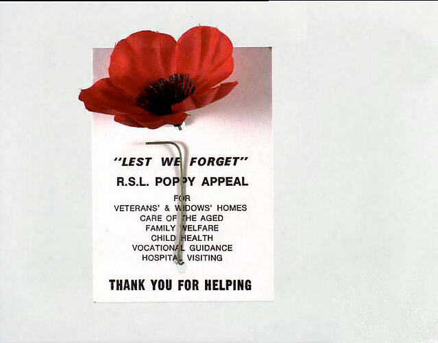 On the front of the card: $1.00/LEST WE FORGET/R.S.L.POPPY APPEAL/THANK YOU FOR HELPING. The money raised by the appeal was to go for veterans' and widows' homes/care of the aged/family welfare/child health/ vocational guidance/hospital visiting.