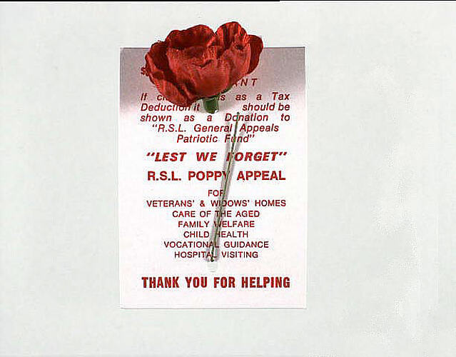 A rectangular piece of cardboard,with two small,circular holes one being close to the bottom of the card,one closer to the top.Through those two holes,a synthetic red poppy flower with a green wire stem is attached.The card has writing in red ink on it,stating the price of the poppy ,information about tax deductions,the name of the appeal and its purpose and a note of appreciation.