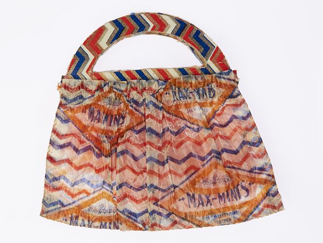 Toy handbag, frame style, made by Mrs Johanna Harry Hillier, nee Gyles, circa 1929-1935, in which was stored toys made from MacRobertson's Max Mint wrappers of waxed paper, printed with a diamond shape in blue and orange with a background of red and blue zig-zag lines.