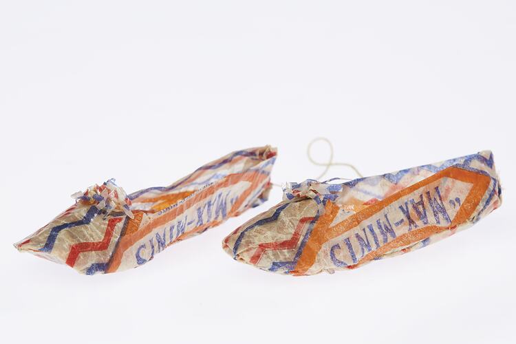 Pair of toy slippers made by Mrs Johanna Harry Hillier, nee Gyles, circa 1929-1935, in which was stored toys made from MacRobertson's Max Mint wrappers of waxed paper, printed with a diamond shape in blue and orange with a background of red and blue zig-zag lines.