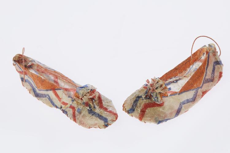 Pair of toy slippers made by Mrs Johanna Harry Hillier, nee Gyles, circa 1929-1935, in which was stored toys made from MacRobertson's Max Mint wrappers of waxed paper, printed with a diamond shape in blue and orange with a background of red and blue zig-zag lines.