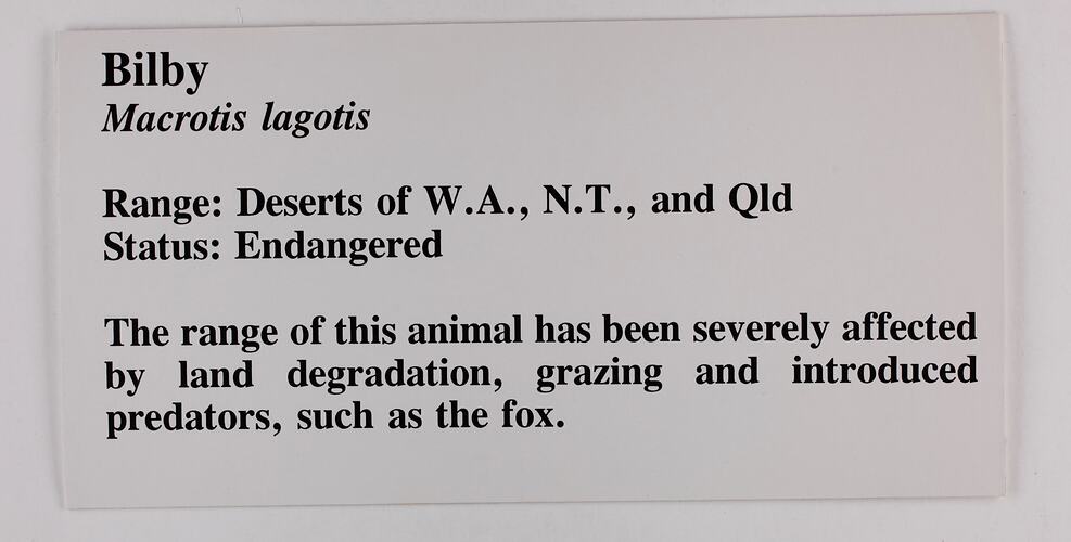 Exhibition label from "Endangered Mammals" display made for Museums Day, 1992, at the National Museum of Victoria.