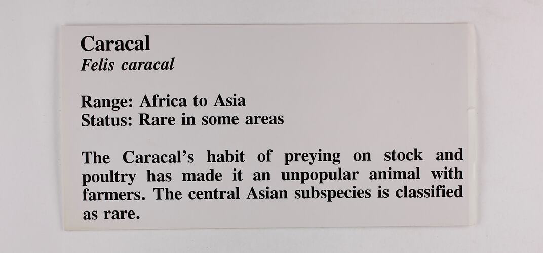 Exhibition label for a Caracal (African wild cat) from "Endangered Mammals" display made for Museums Day, 1992, at the National Museum of Victoria.