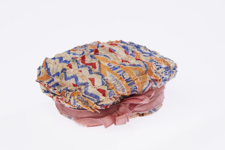 Toy beret-style hat made by Mrs Johanna Harry Hillier, nee Gyles, circa 1929-1935, in which was stored toys made from MacRobertson's Max Mint wrappers of waxed paper, printed with a diamond shape in blue and orange with a background of red and blue zig-zag lines.