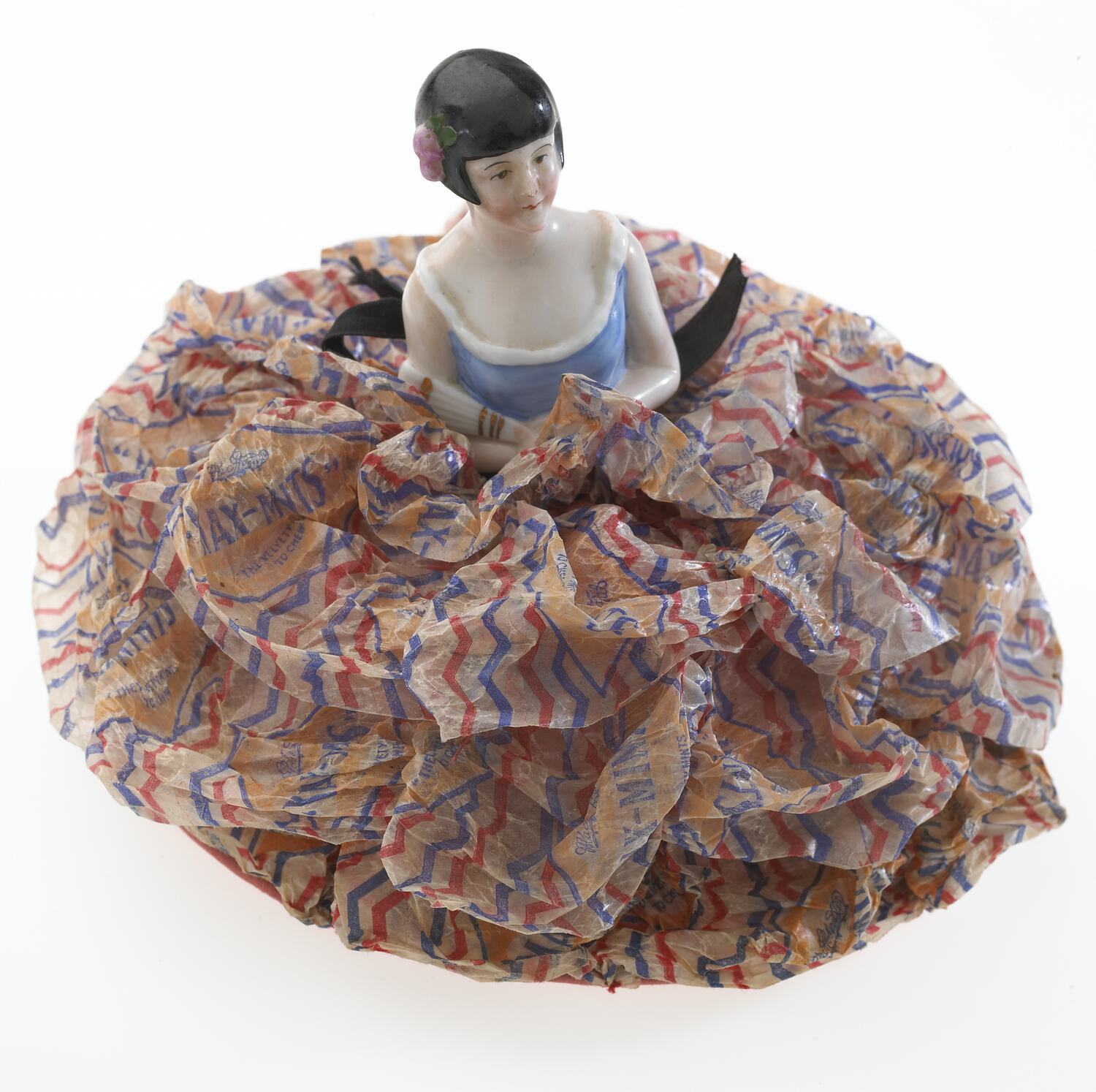 Ceramic female figure with large skirt made of pink fabric and Max Mint confectionary wrappers. It was made by Mrs Johanna Harry Hillier, nee Gyles, circa 1929-1935, from MacRobertson's Max Mint wrappers of waxed paper, printed with a diamond shape in blue and orange with a background of red and blue zig-zag lines.