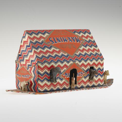 House-shaped structure on base made from Max Mints confectionary boxes, accompanied by wooden animals, possibly representing Noah's Ark. The boat was made by Mrs Johanna Harry Hillier, nee Gyles, circa 1929-1935, from MacRobertson's Max Mint wrappers of waxed paper, printed with a diamond shape in blue and orange with a background of red and blue zig-zag lines.