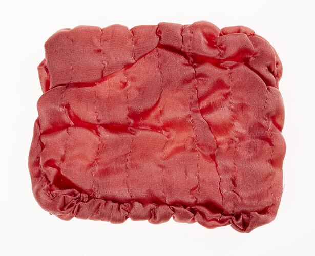 Doll sized coverlet of pink satin-like fabric to go on canopied bed. Rectangular shape. Rows of gathered stitching producing a padded effect.